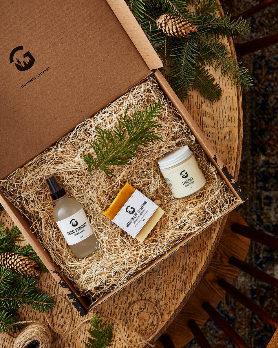 À l’ouverture, un ruban vert, une carte de souhait et un chocolat au sapin donnent le ton : ce cadeau sera vraiment spécial! Chaque produit Gourmet Sauvage est positionné avec soin de manière à créer l’émerveillement dès qu’on retire le papier de soie qui les recouvre.