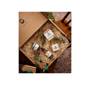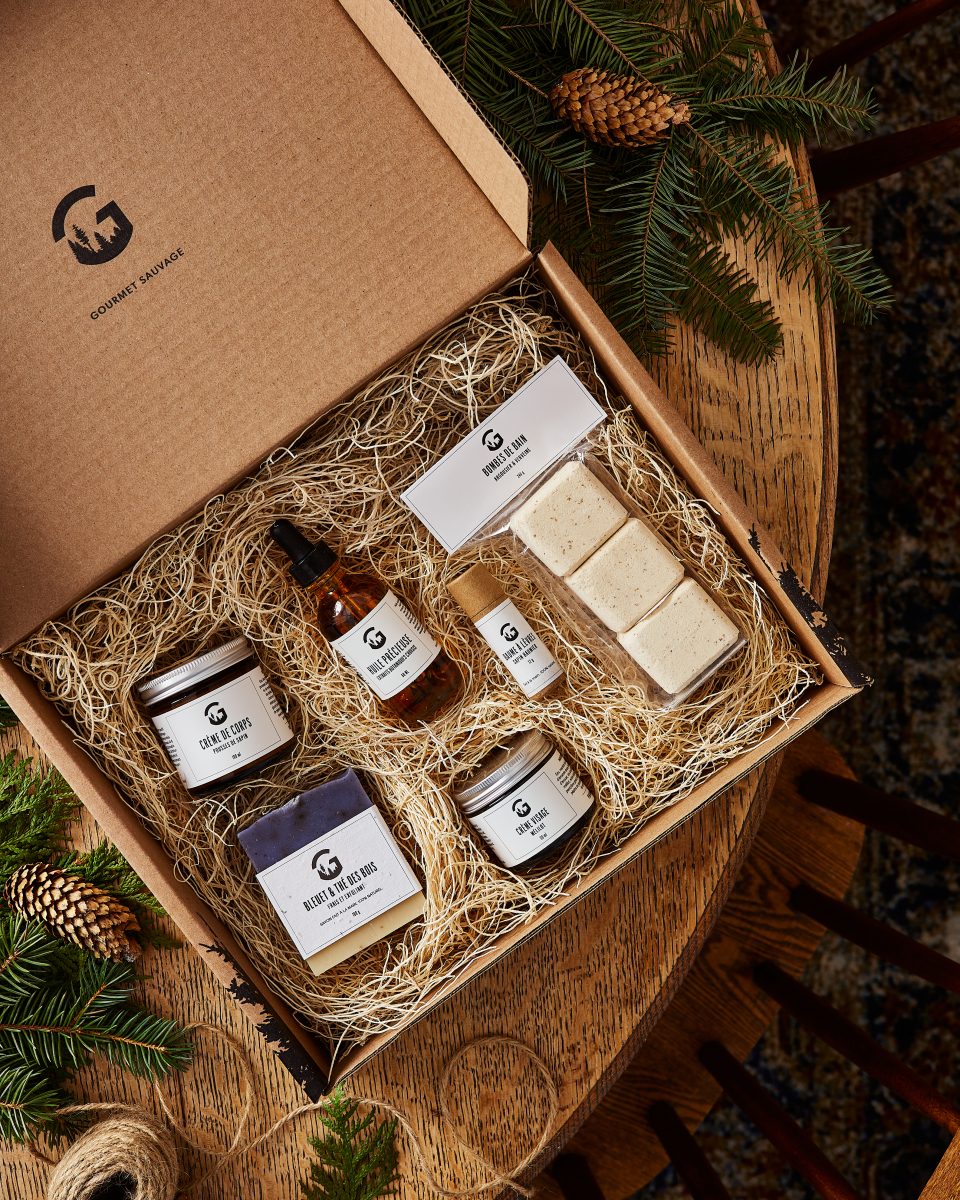 À l’ouverture, un ruban vert, une carte de souhait et un chocolat au sapin donnent le ton : ce cadeau sera vraiment spécial! Chaque produit Gourmet Sauvage est positionné avec soin de manière à créer l’émerveillement dès qu’on retire le papier de soie qui les recouvre.