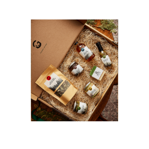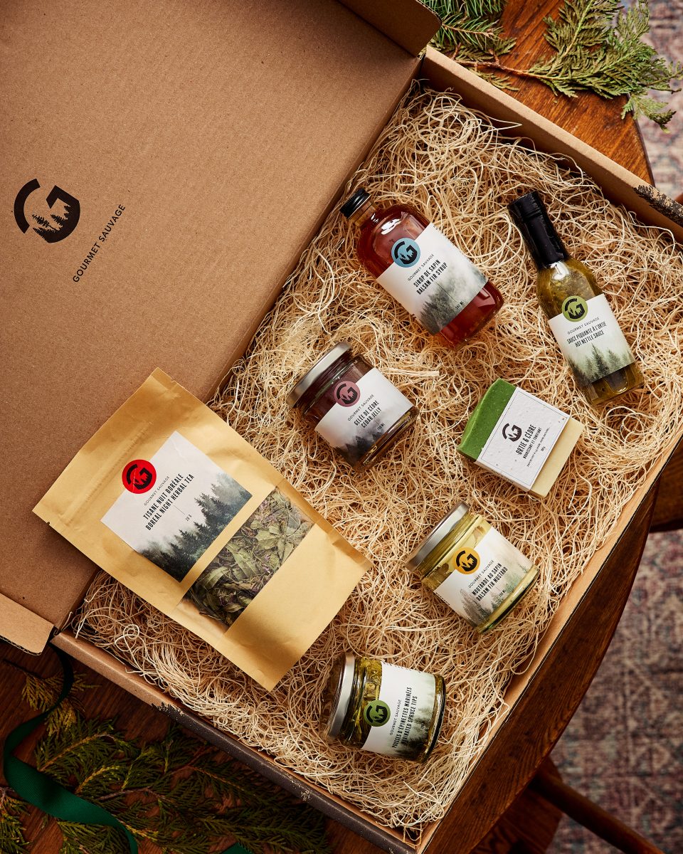 À l’ouverture, un ruban vert, une carte de souhait et un chocolat au sapin donnent le ton : ce cadeau sera vraiment spécial! Chaque produit Gourmet Sauvage est positionné avec soin de manière à créer l’émerveillement dès qu’on retire le papier de soie qui les recouvre.