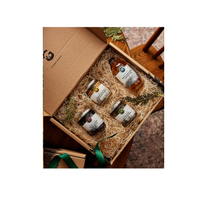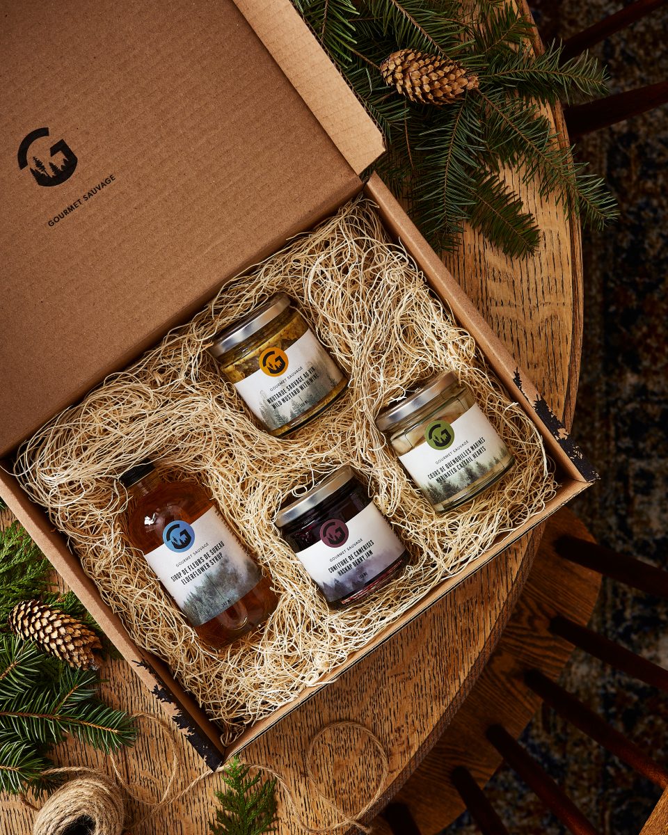 À l’ouverture, un ruban vert, une carte de souhait et un chocolat au sapin donnent le ton : ce cadeau sera vraiment spécial! Chaque produit Gourmet Sauvage est positionné avec soin de manière à créer l’émerveillement dès qu’on retire le papier de soie qui les recouvre.
