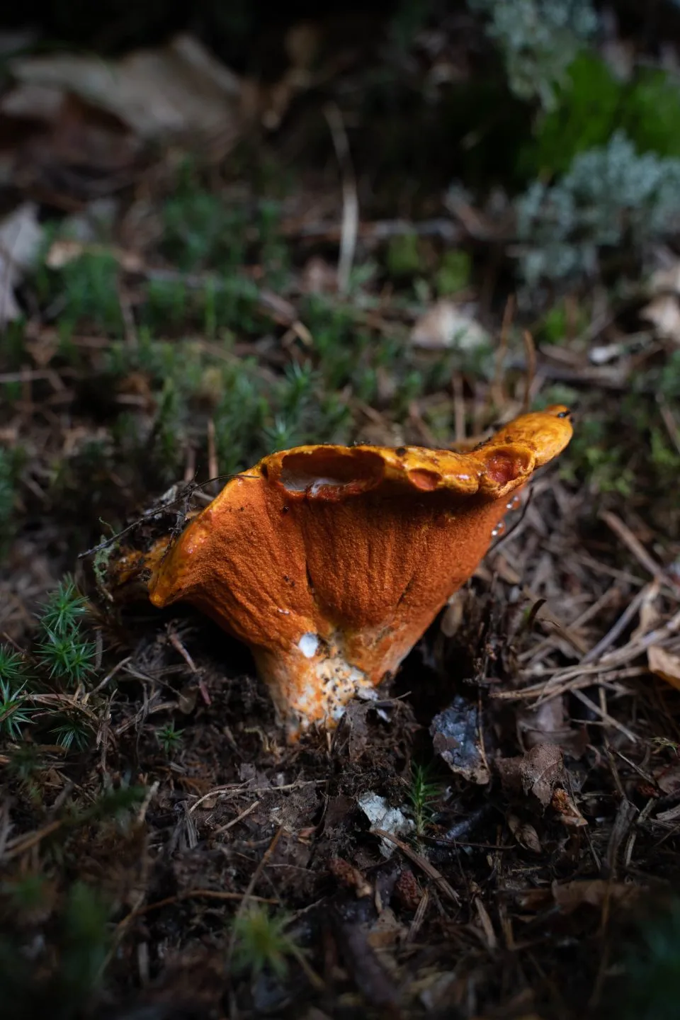 Le champignon crabe est en fait deux champignons! La russule à pied court, comestible mais plutôt insipide, se fait attaquer par un autre champignon, le Hypomyces lactifluorum et devient alors le magnifique champignon que nous connaissons.